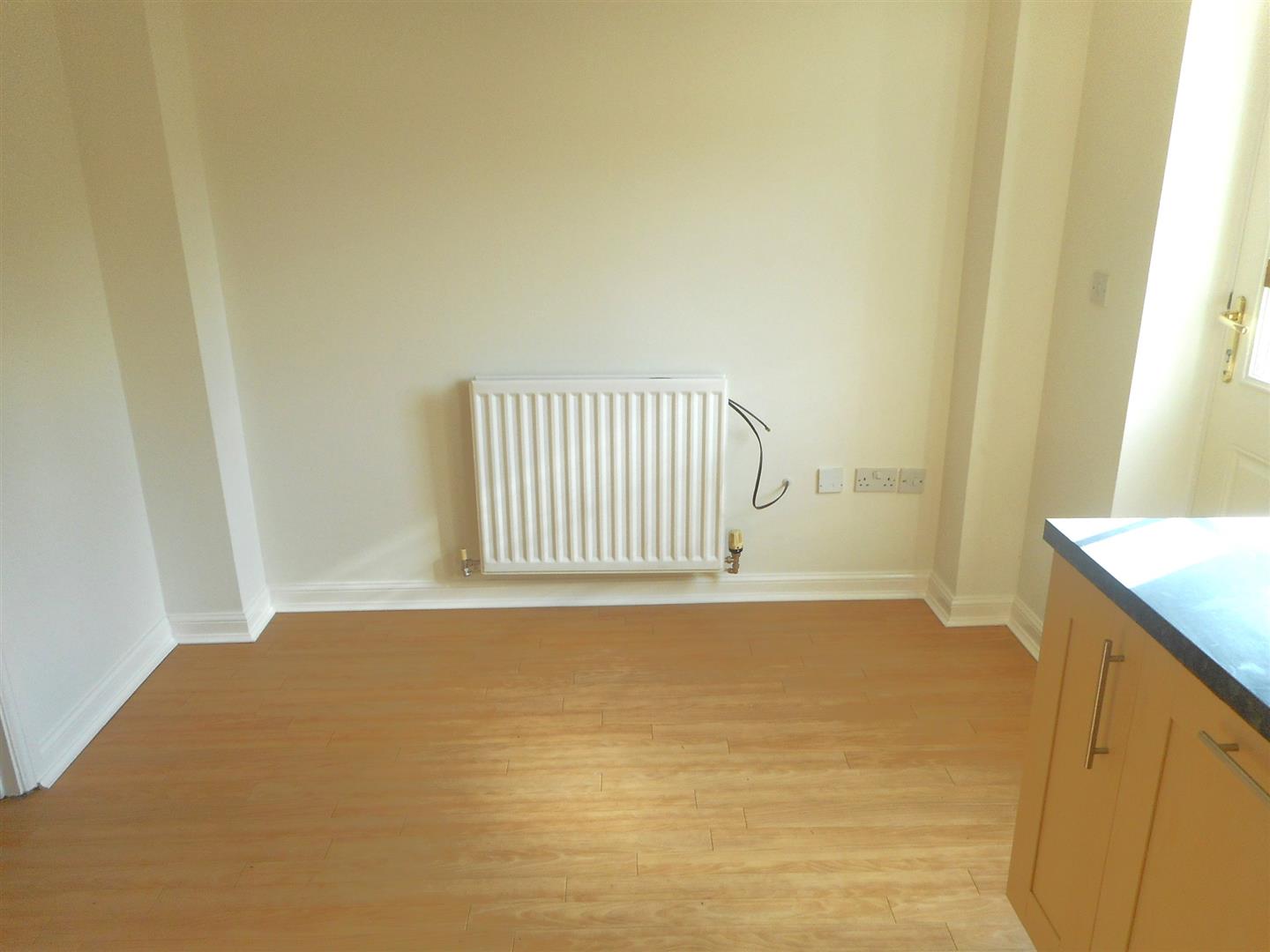 Laminate wood flooring, radiator, understairs storage.