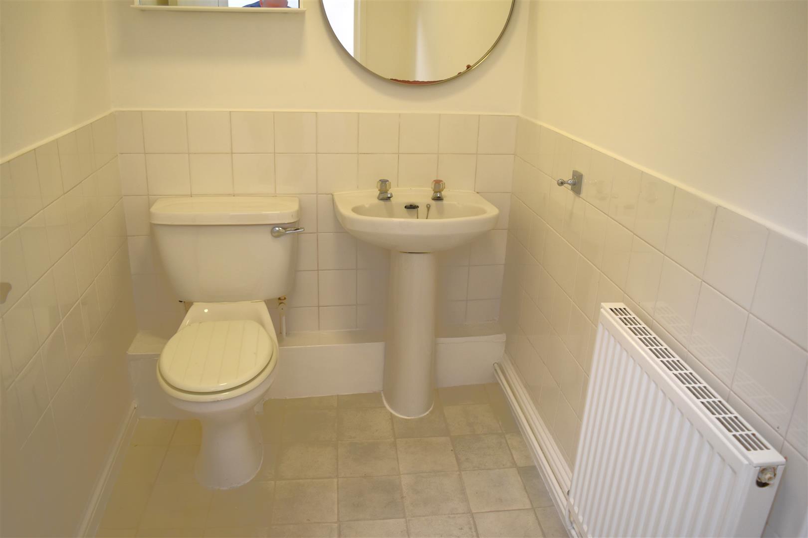 White suite comprising: Low level W.C., pedestal hand wash basin and taps, extractor fan, radiator.