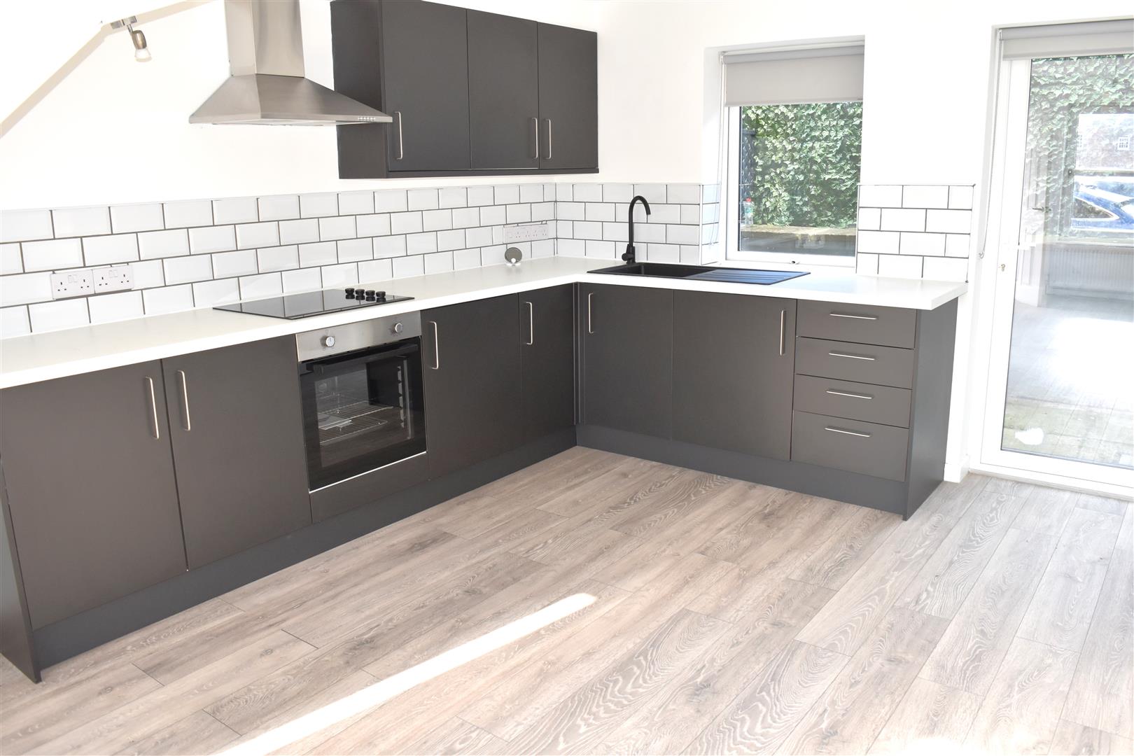 Open plan lounge, dining kitchen with a range of modern wall and base units with work surface over, unit housing sink and drainer with swivel mixer tap, integrated four ring electric hob and oven with extractor hood over. Integrated fridge freezer and washing machine. Double glazed window to front and rear aspects, tv and phone point, storage cupboard, double radiator, laminate wood flooring. Stairs leading to: