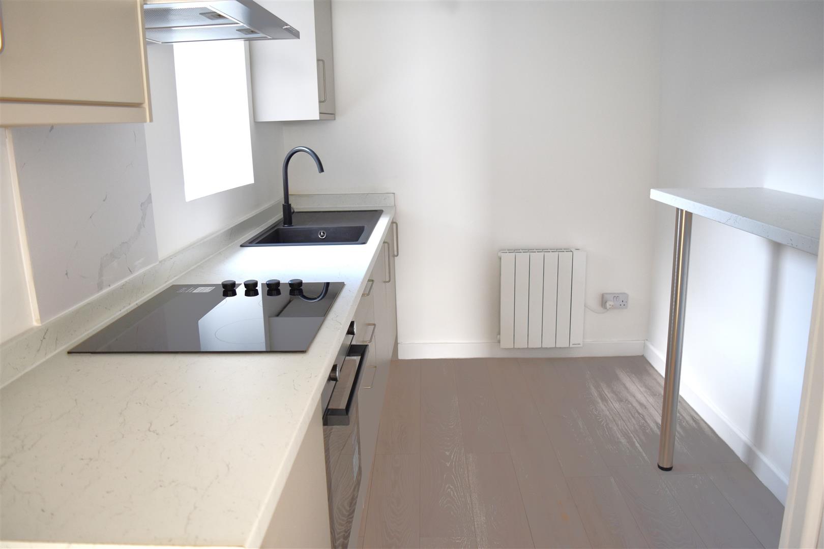 Range of modern wall and base units with work top over, unit housing sink and drainer with swivel mixer tap, integrated four ring electric hob and oven with extractor hood over, integrated fridge freezer and washing machine. breakfast bar, wall mounted electric heater, laminate wood flooring. Storage cupboard housing hot water tank.