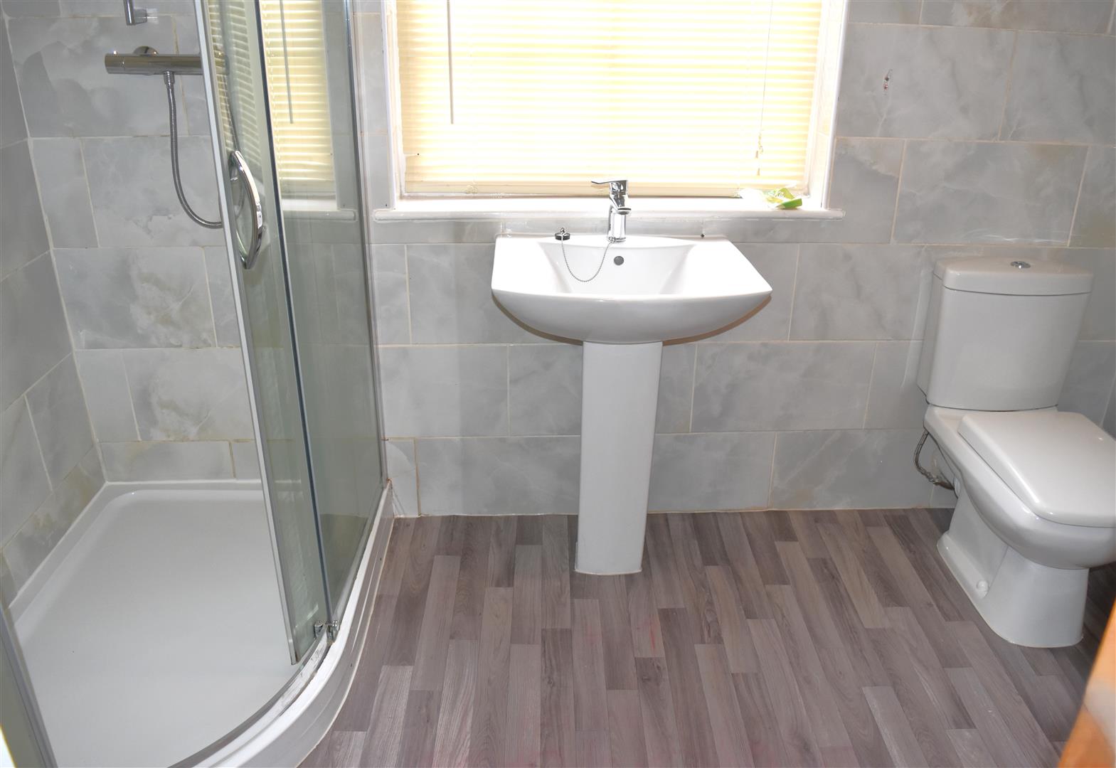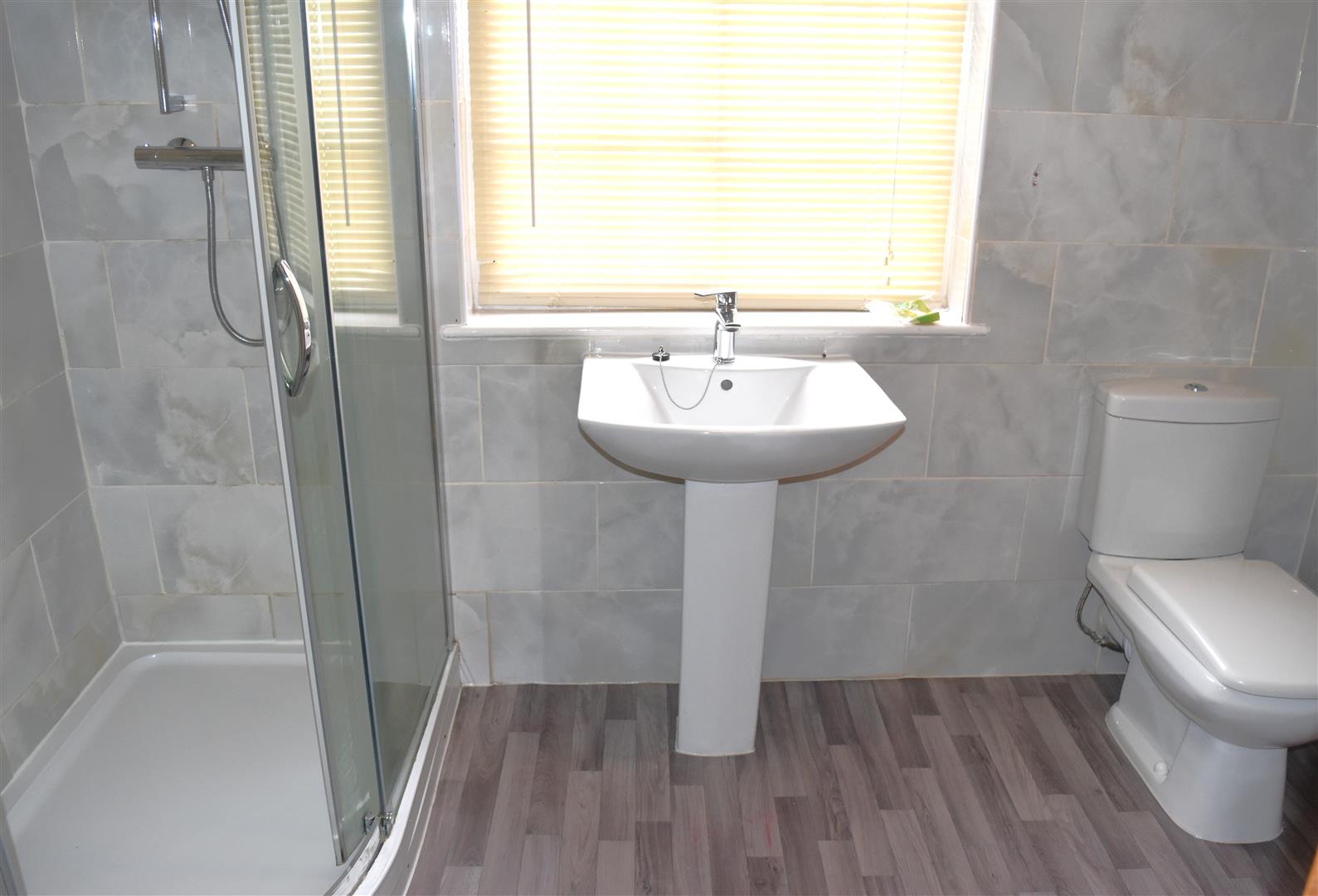 Modern white suite comprising; low level W.C., shower cubicle housing mains shower, pedestal hand wash basin with mixer tap, radiator, double glazed window to side aspect.