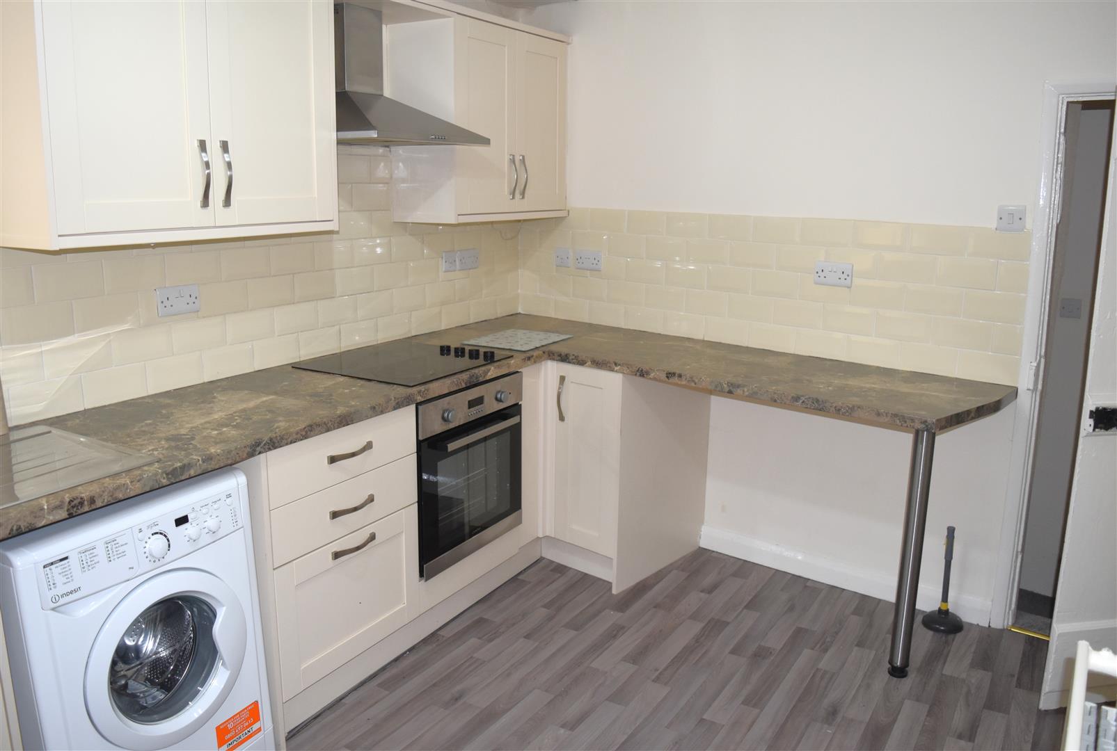 Range modern wall and base units with work top over, integrated oven and hob with extractor hood over, sink unit housing bowl and drainer with swivel mixer tap, space and plumbing for washing machine, space for upright fridge freezer and double glazed window to side aspect.