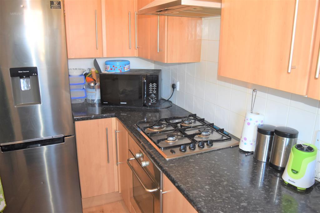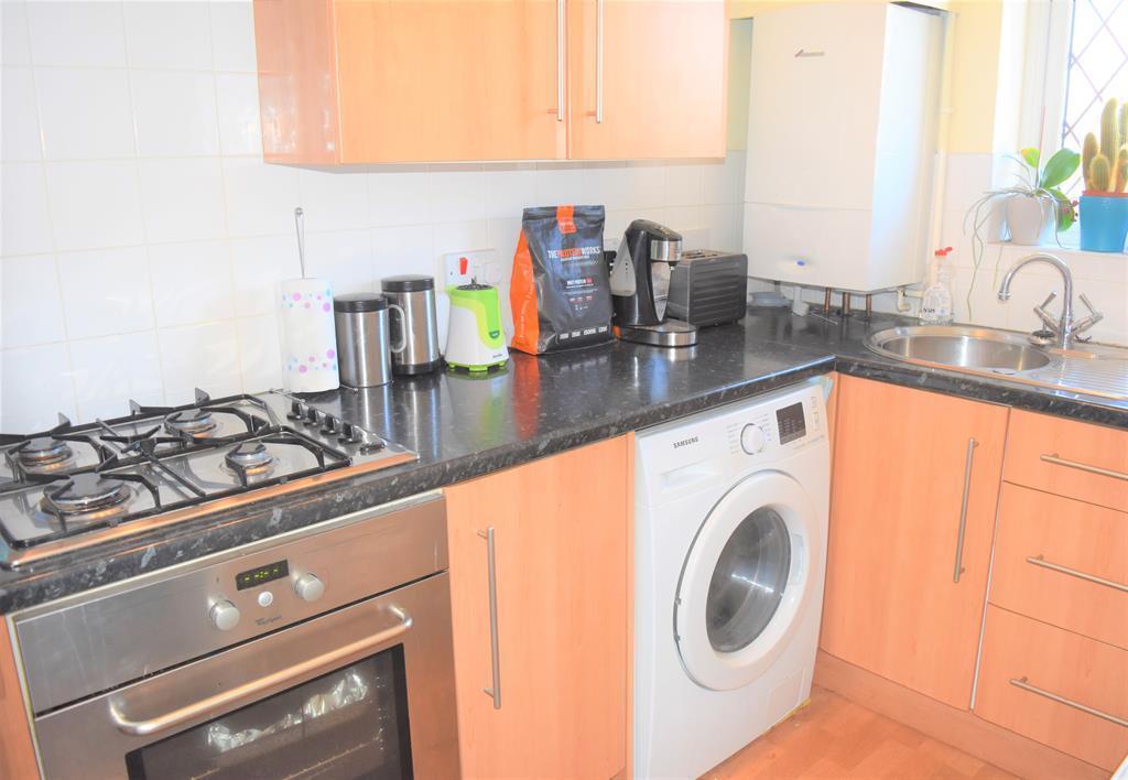 Range of modern wall and base units with roll top work surface over, stainless steel sink and drainer with swivel mixer tap, wall mounted combi boiler, integrated four ring gas hob and oven with extractor hood over, space for upright fridge freezer, under counter space and plumbing for washing machine, double radiator, ceiling coving, tiled splash back, double glazed window to front aspect.
