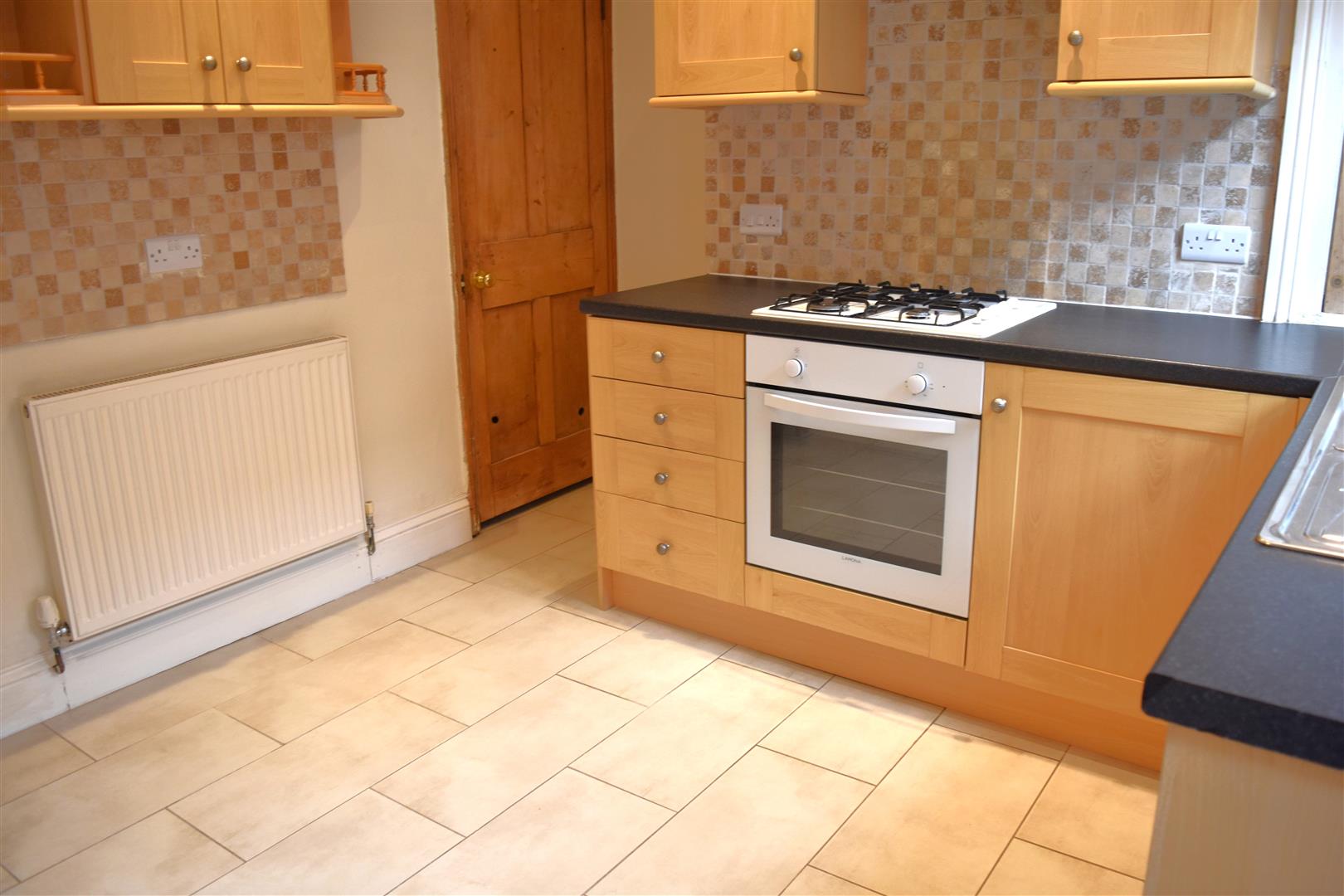 Range of modern wall and base units with roll top work surface over, integrated four ring gas hob and electric oven with extractor hood over, stainless steel sink unit housing bowl and drainer with swivel mixer tap, inset ceiling spot lights, radiator, tiled floor, cupboard housing combi boiler, understairs storage cupboard, double glazed window to rear aspect and part glazed rear door.