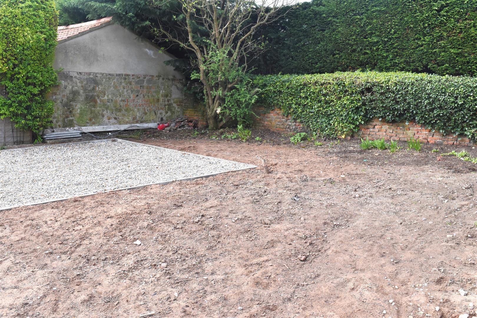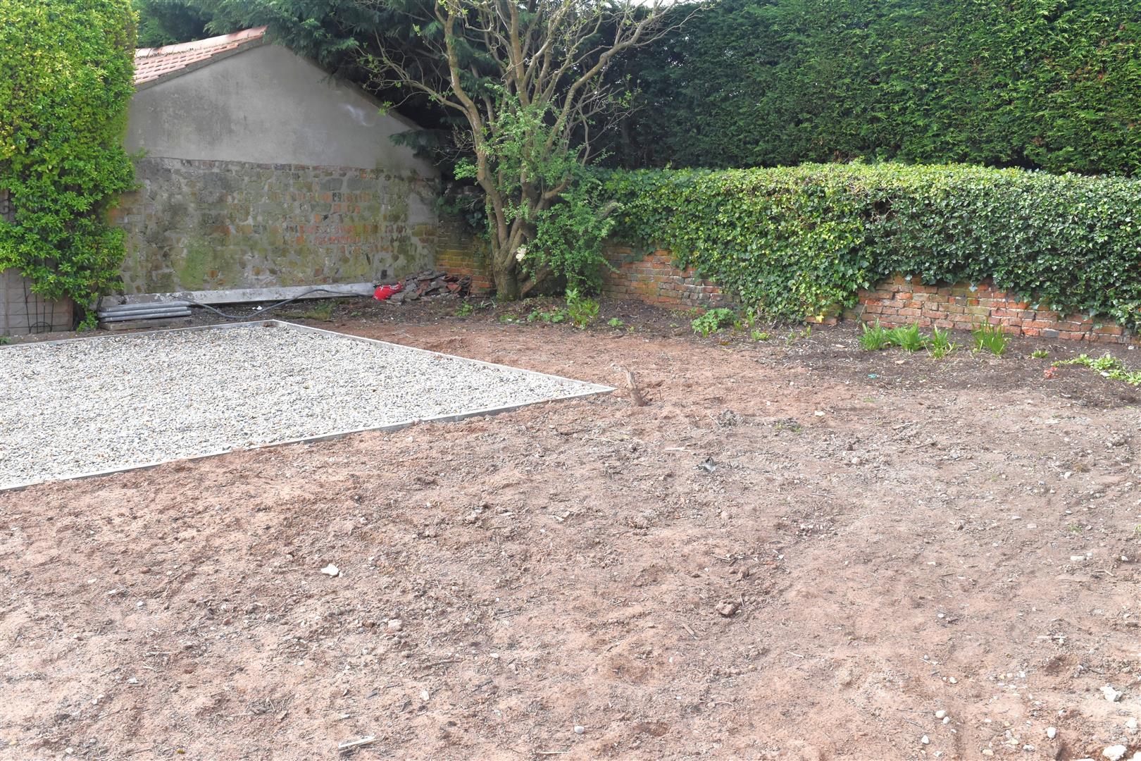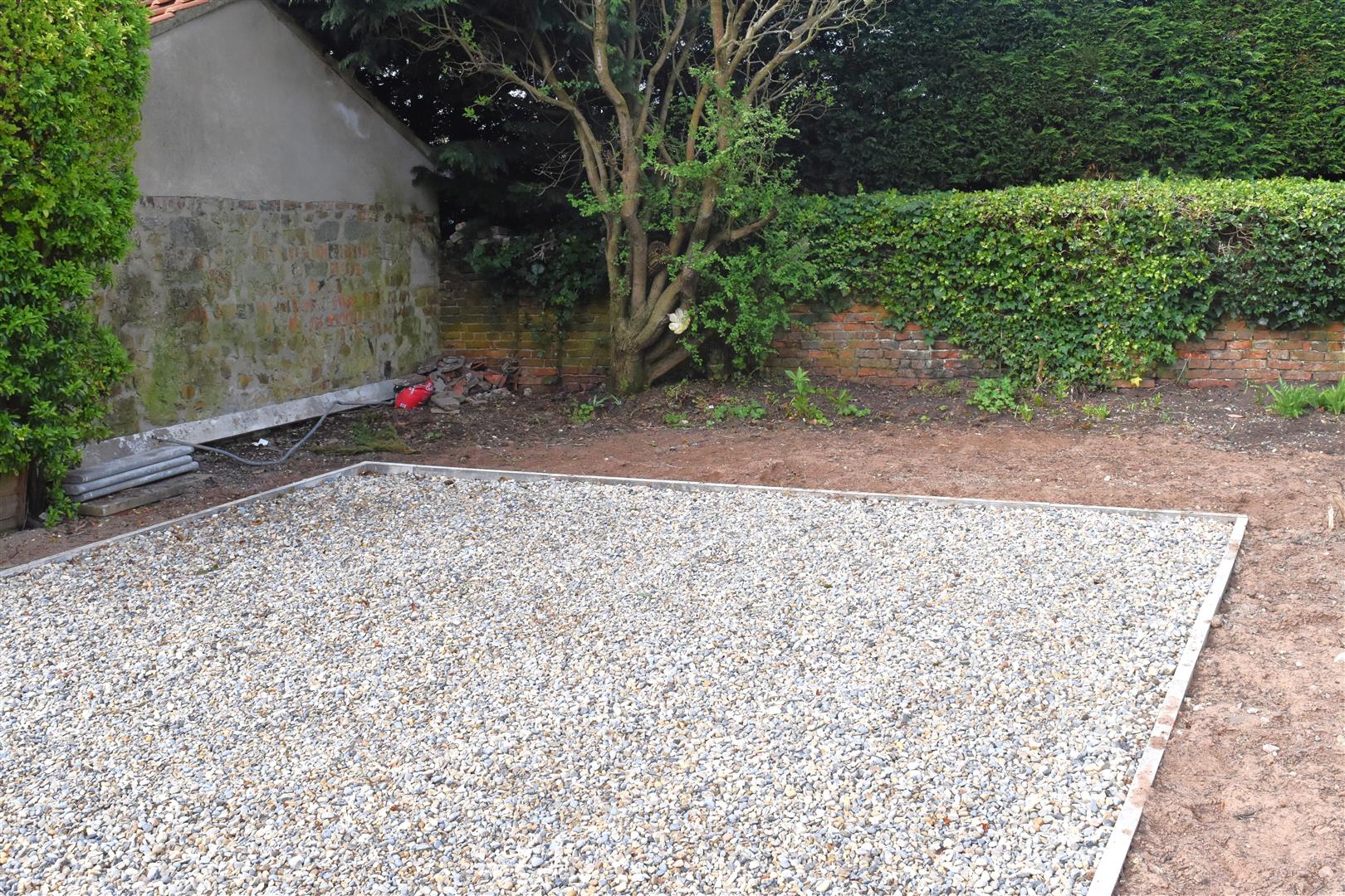 Decked seating area with steps leading down to a generous sized plot with enclosed low maintenance gravelled area to three sides with fenced and hedge perimeters.