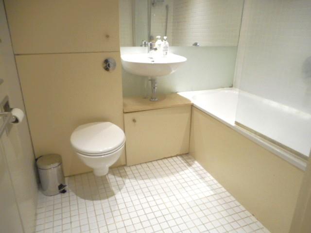 Modern white suite comprising: Panelled bath with overhead shower, wall hung basin and taps, low level W.C., inset ceiling spot lights, built in cupboard housing washer/dryer.