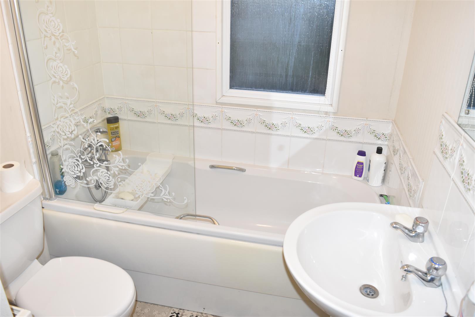 White suite comprising: Panelled bath with shower attachment, low level W.C., pedestal hand wash basin and taps, extractor fan,, double glazed window to side aspects, double radiator.