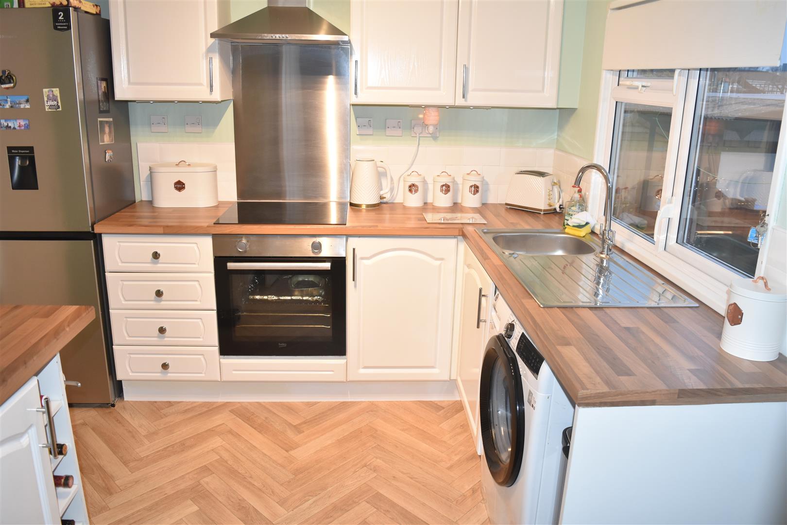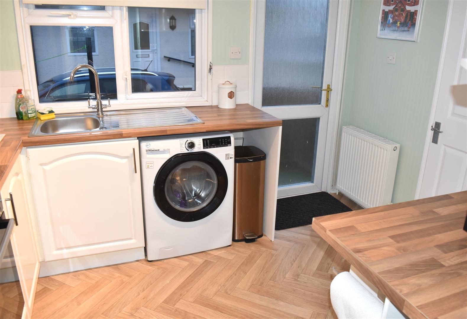 Range of wall and base units with roll top work surface over, sink unit housing stainless steel bowl, drainer and swivel mixer tap, integrated four ring electric hob and oven with extractor hood over, cupboard housing boiler, space for upright fridge freezer, space and plumbing for washing machine, double radiator, ceiling coving, double glazed window and door to side aspect.