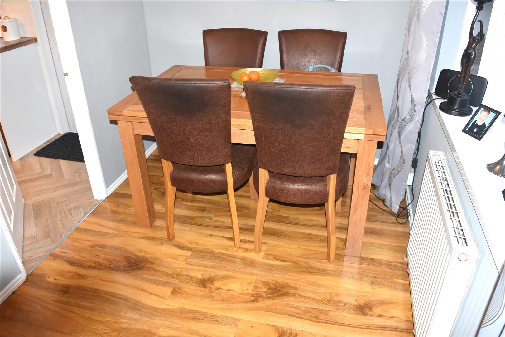Storage cupboard, ceiling coving, laminate wood flooring.
