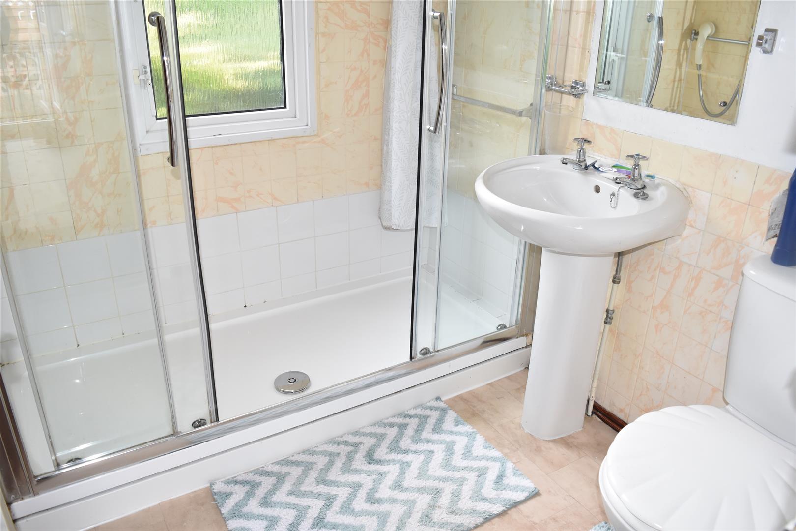 Modern white suite comprising: Double shower cubicle with Mira Zest electric shower over, low level W.C., pedestal hand wash basin and taps, radiator, ceiling coving, storage cupboard, double glazed window to side aspect.