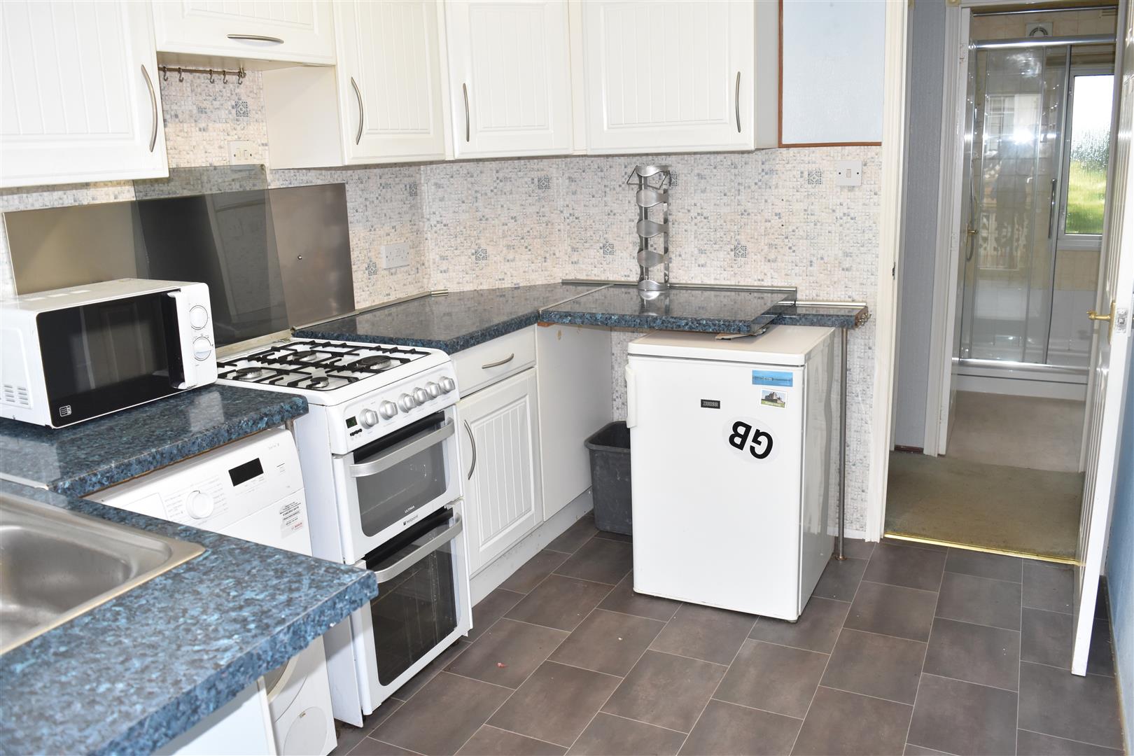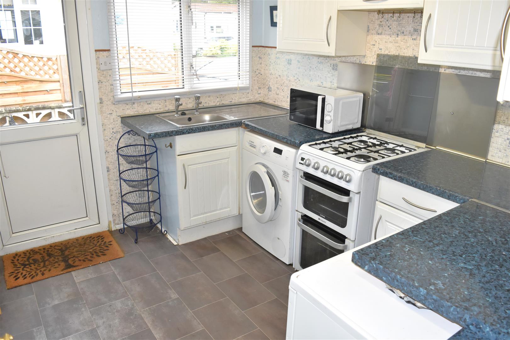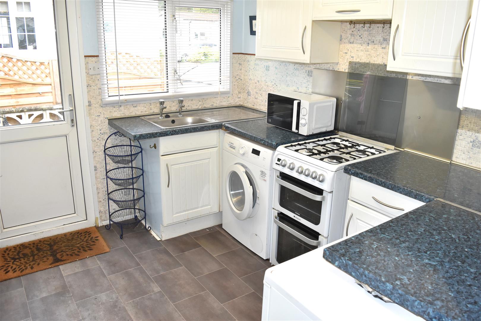 Range of modern wall and base units with work surface over, sink unit housing stainless steel basin, drainer and taps, space for cooker, under counter space and plumbing for washing machine, undercounter space for fridge, radiator, ceiling coving, double glazed door and window to side aspect.