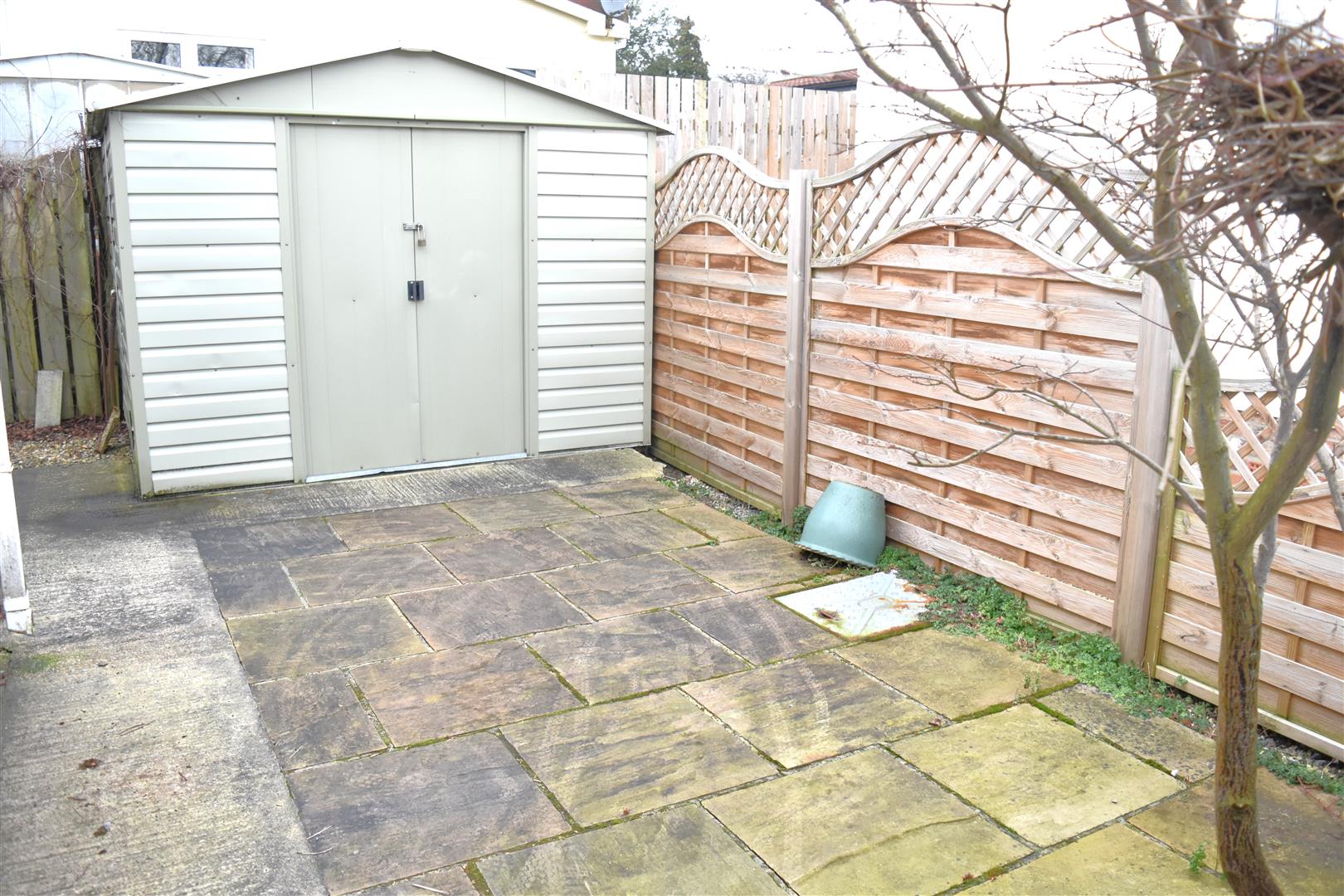 To the side of the property is a driveway providing off street parking leading to patio seating area, metal storage shed and fence perimeter.
