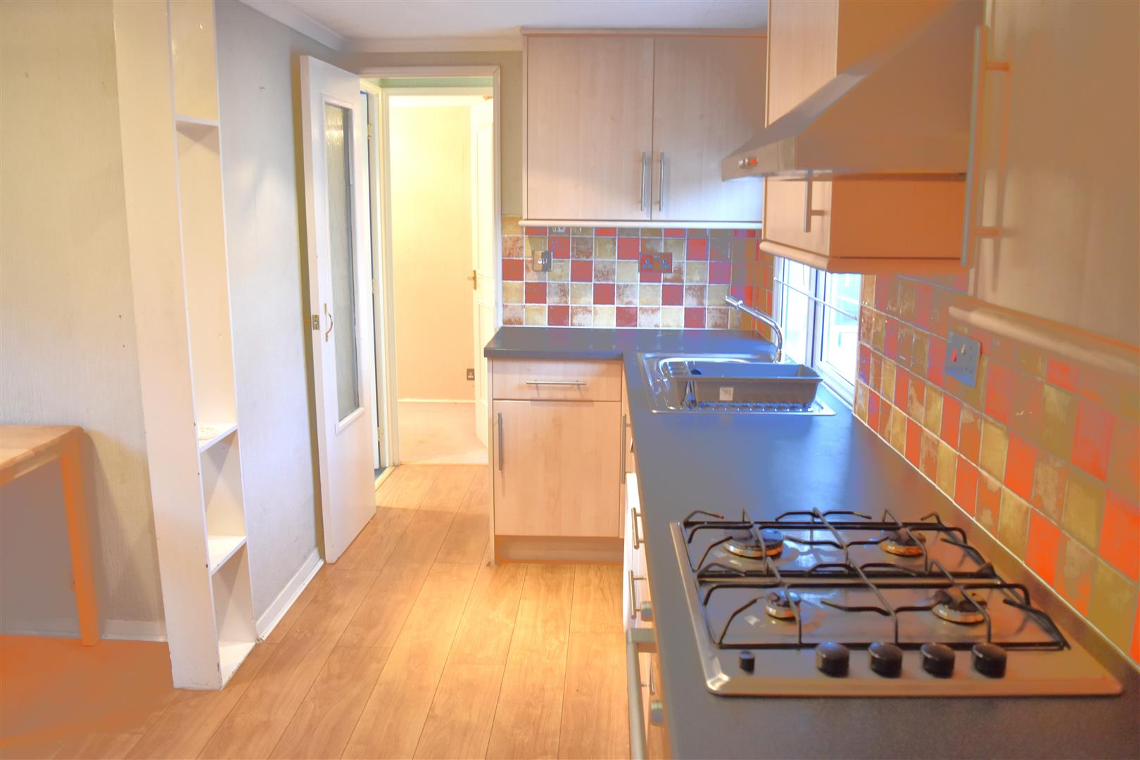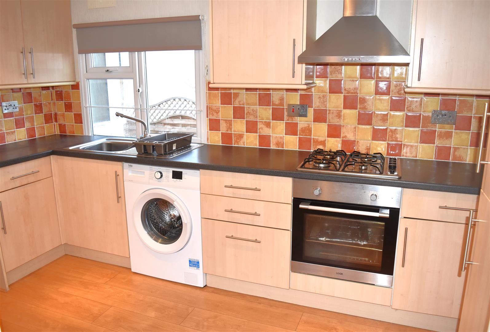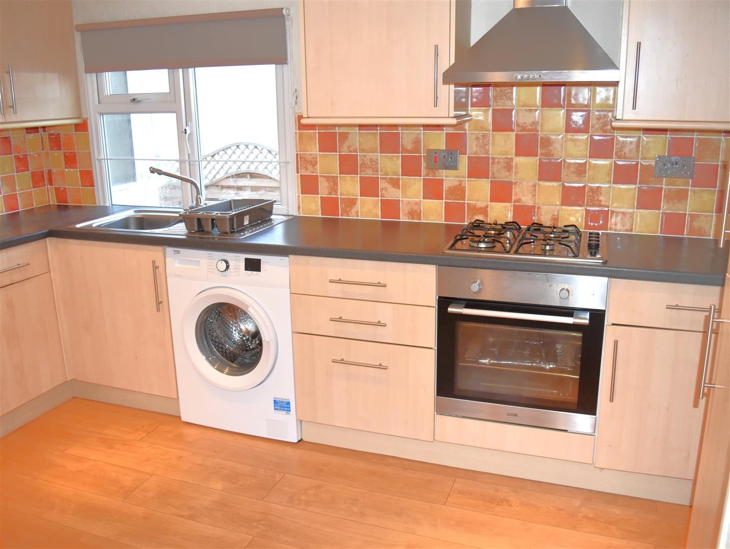 Range modern wall and base units with work top over, integrated 4 ring gas hob and oven with extractor hood over, integrated fridge freezer, sink unit housing bowl and drainer with swivel mixer tap, undercounter space and plumbing for washing machine, laminate wood flooring, inset ceiling spot lights, radiator, storage cupboard housing central heating boiler, double glazed window to both sides.