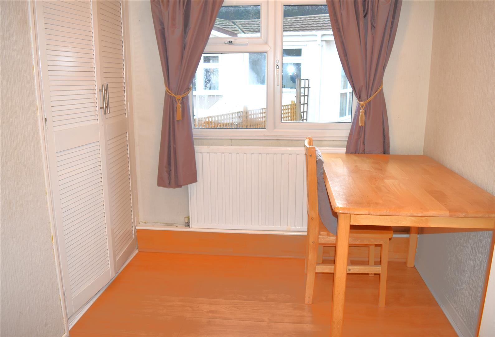 Double glazed door leading into hall, laminate wood floor, storage cupboard.