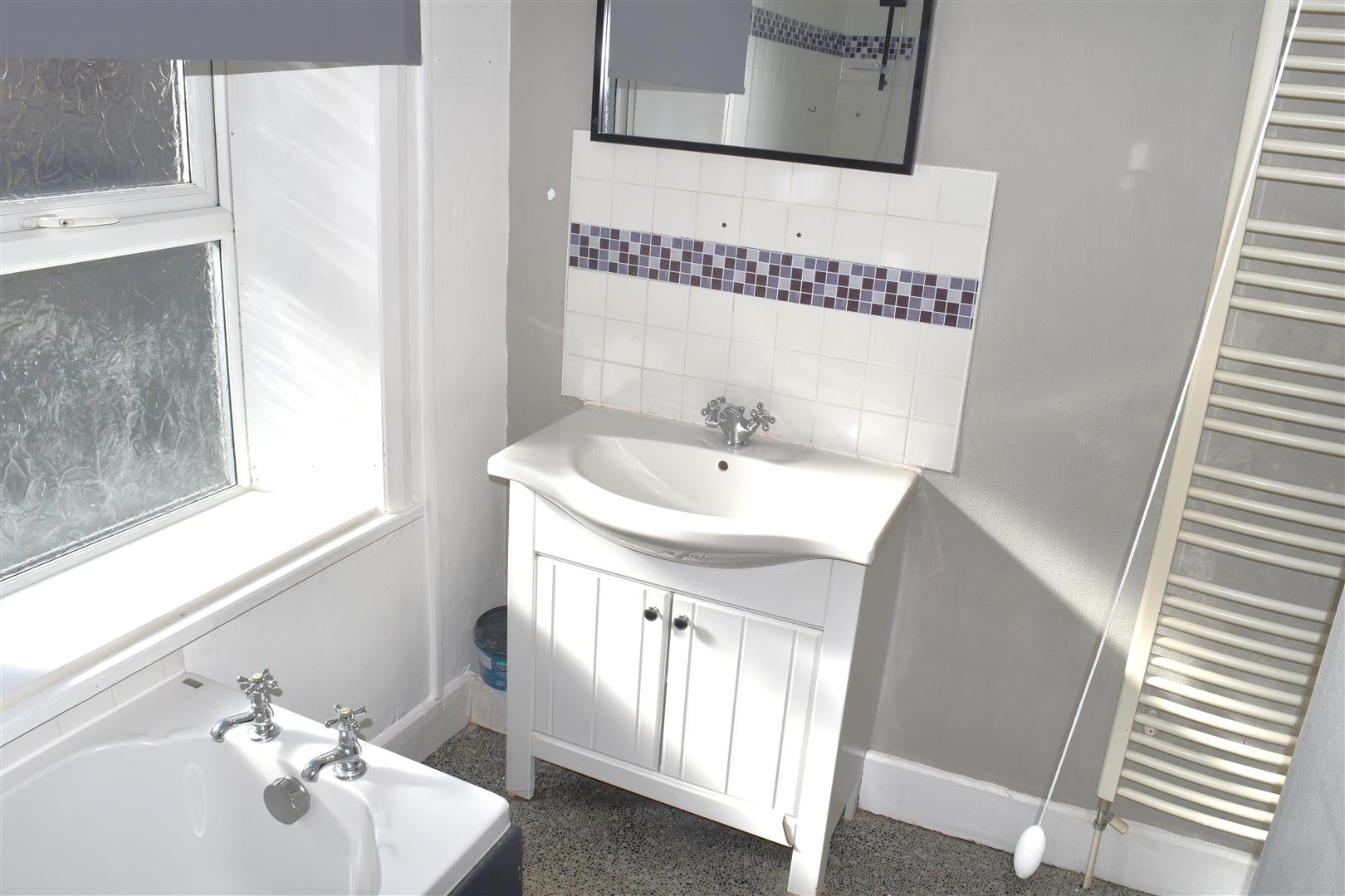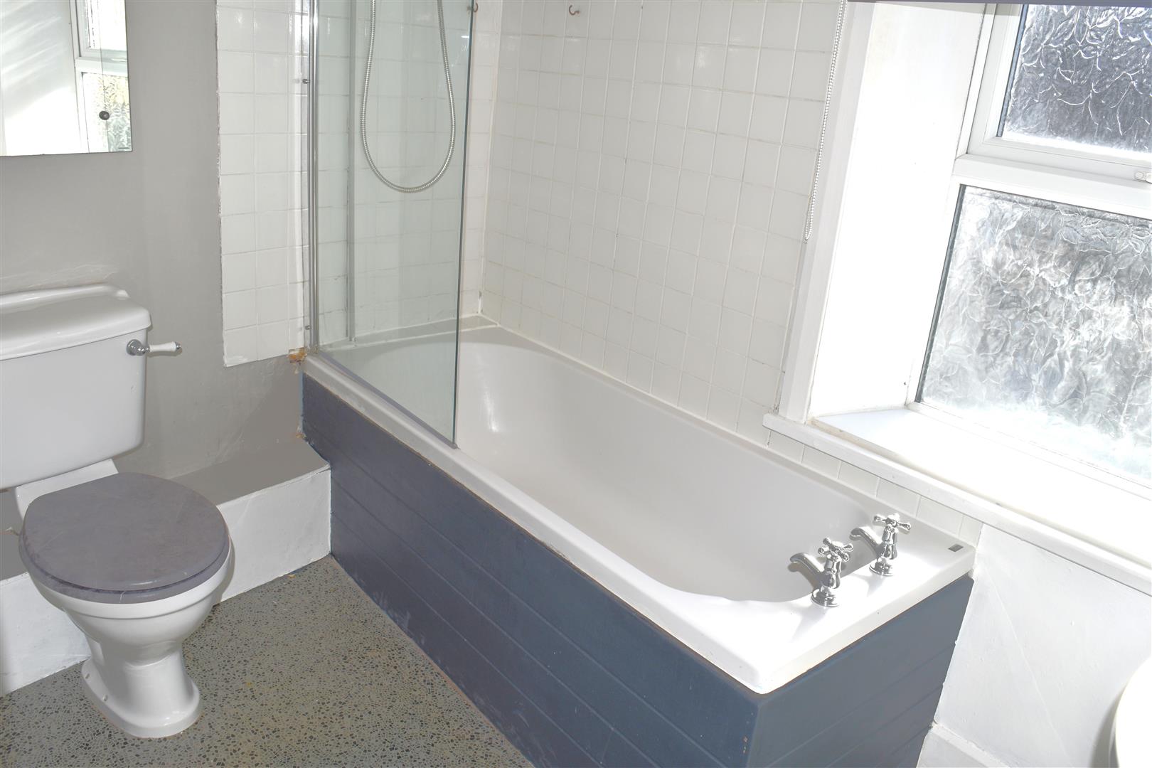 White suite comprising: Panelled bath with over head shower, low level W.C., vanity unit housing basin and tap, wall mounted heated towel rail, double glazed window to front aspect.
