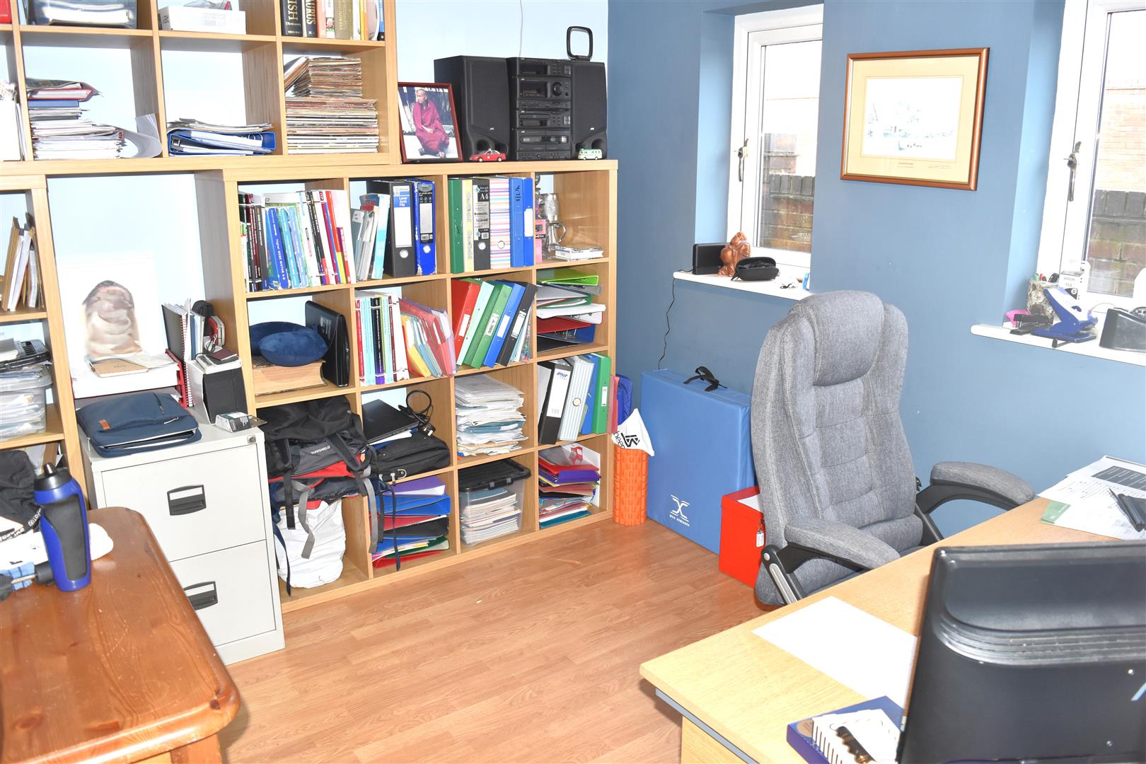 Solid wood floor, two x double glazed windows to side aspect, ceiling coving, double radiator.