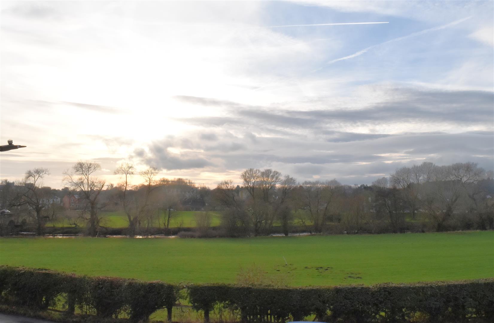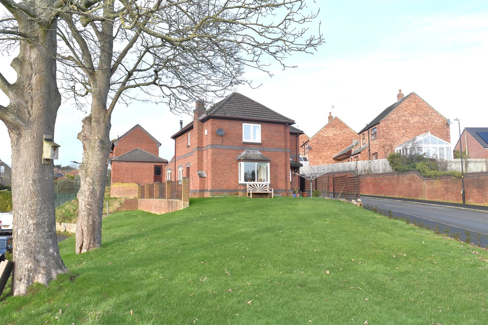 Extensive open plan lawned garden extending to the side of the property leading to raised patio area full length to one side with open views.