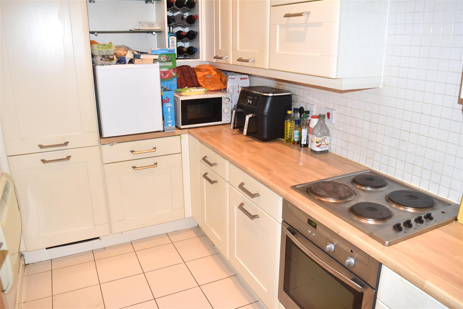 Range of modern wall and base units with work surface over, sink unit housing bowl and drainer with swivel mixer tap, four ring electric hob and oven with extractor hood over, integrated fridge/freezer, integrated washer/dryer, inset ceiling spot lights, tiled floor, electric storage heater.