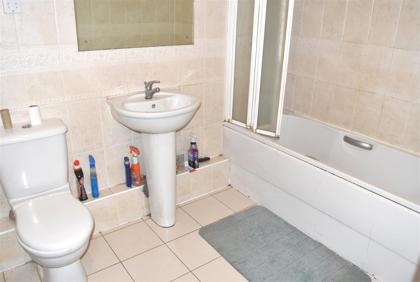 White suite comprising; panelled bath with overhead mains shower, pedestal hand wash basin and taps, low level W.C., extractor fan, shaver socket, wall mounted electric towel rail, inset ceiling spot lights, tiled floor.